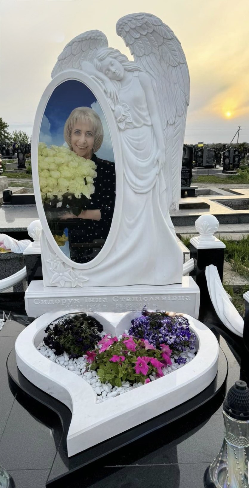 Изысканный памятник из белоснежного мрамора с объёмной скульптурой ангела — трогательное и символичное решение для оформления женского захоронения. Мягкие линии, овальное фотостекло и выразительная скульптура передают атмосферу покоя, заботы и света. Особое внимание привлекает цветник в виде сердца, оформленный декоративной мраморной крошкой и живыми цветами.