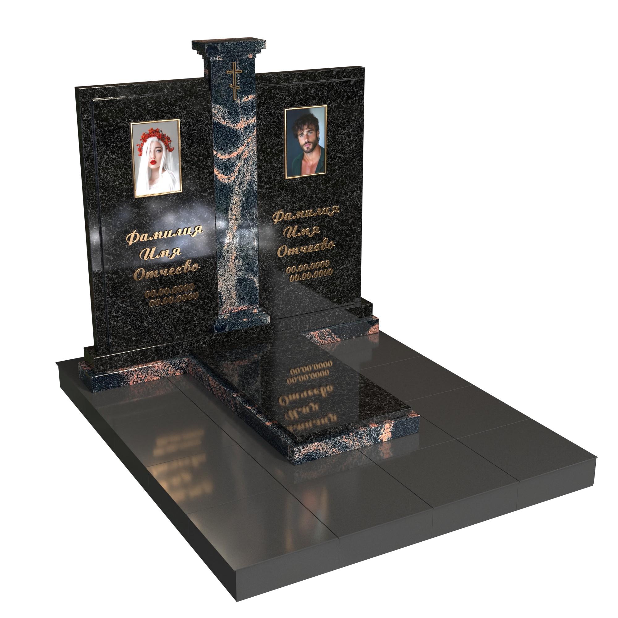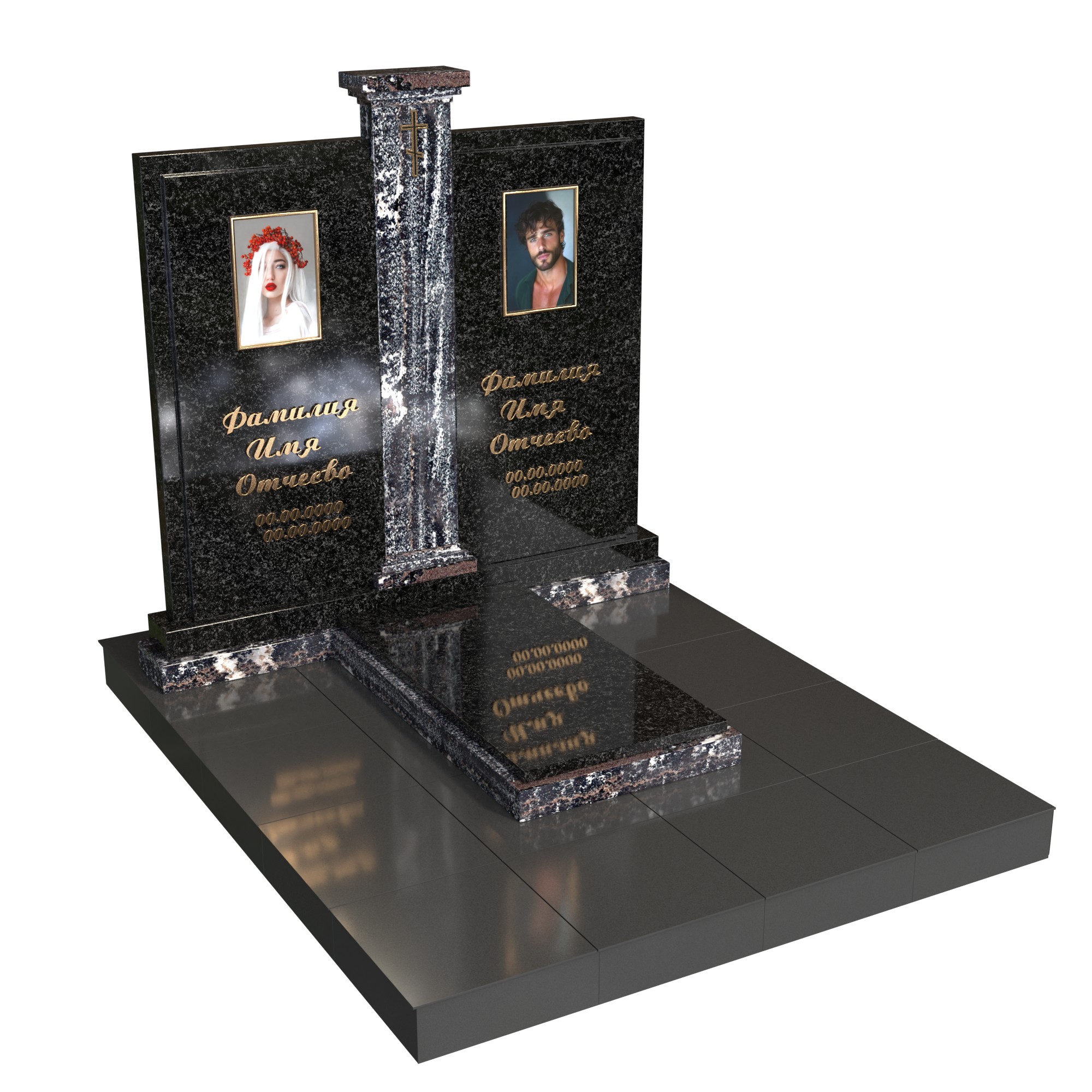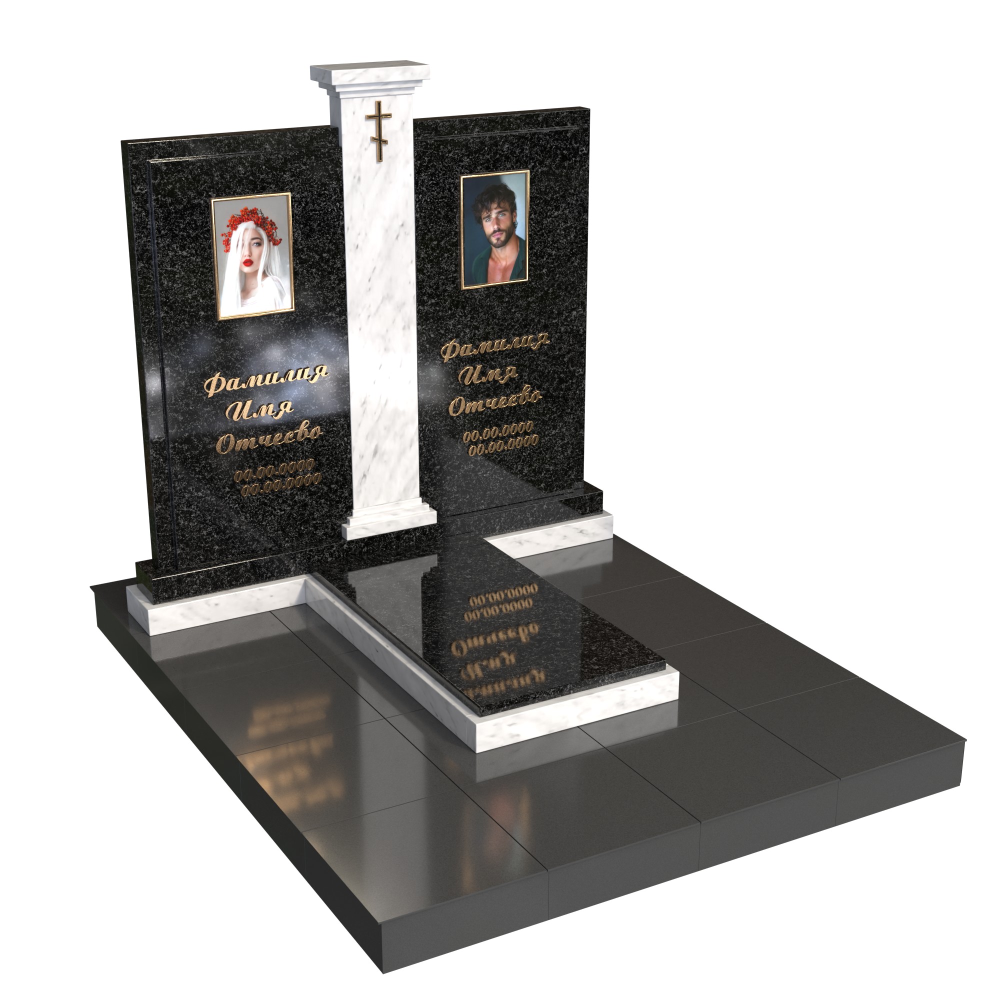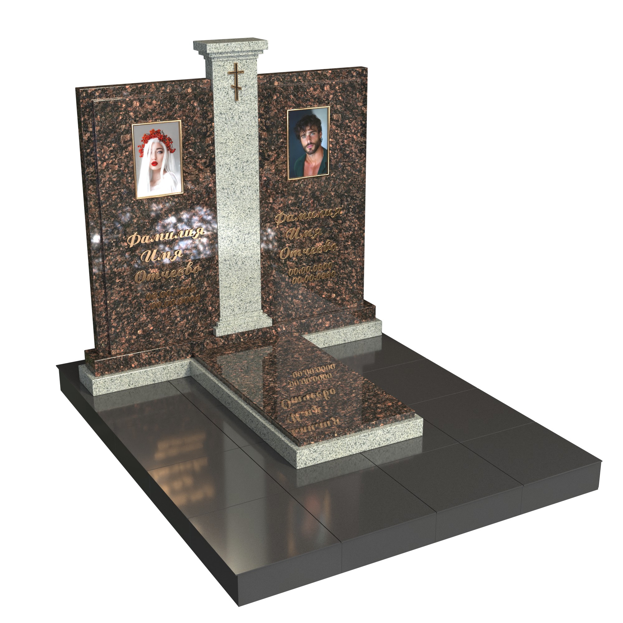 Памятник «Арочная классика» — элегантная модель из натурального камня с высокой арочной стелой. В центре — фотопортрет на стекле (крепление на метизах) и именная гравировка; сверху — аккуратный крест. Двухуровневая надгробная плита с контрастной вставкой подчёркивает строгую геометрию. Композицию дополняют цилиндрическая ваза и лампада, формируя ухоженный, торжественный вид участка.