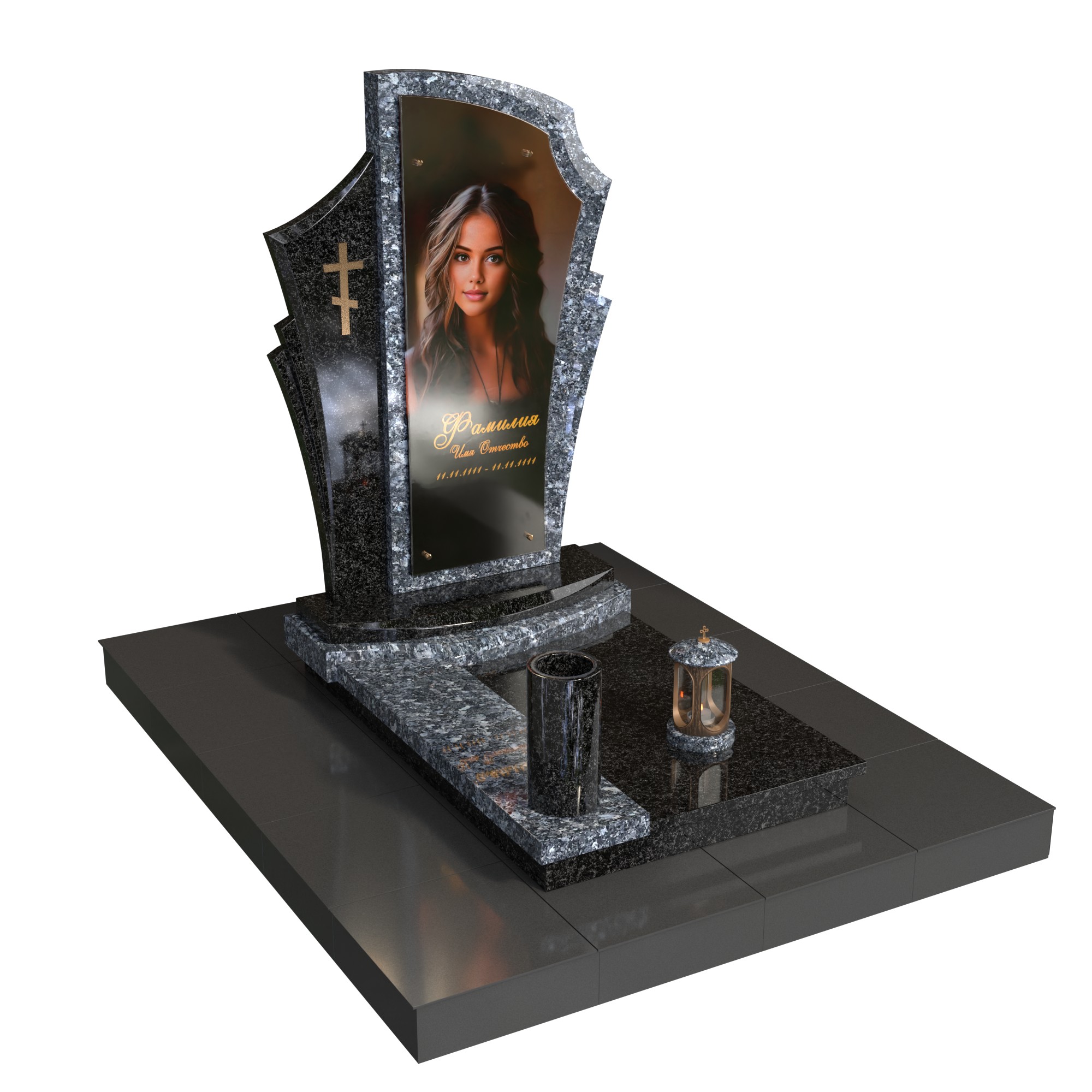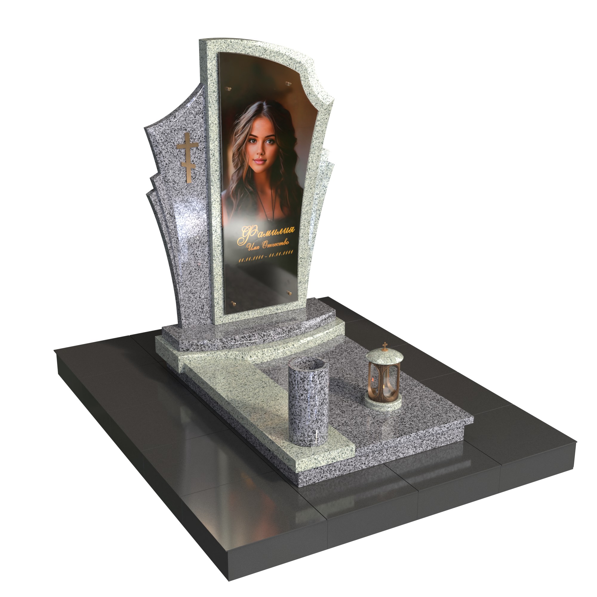Памятник «Покров света» — современная авторская модель из натурального камня. Фигурная стела со светлым обрамлением и боковой плоскостью с аккуратным крестом образует изящный силуэт и подчёркивает фотопортрет на стекле (крепление на метизах). Двухуровневое основание, цилиндрическая ваза и лампада на подиуме создают цельную, ухоженную композицию.