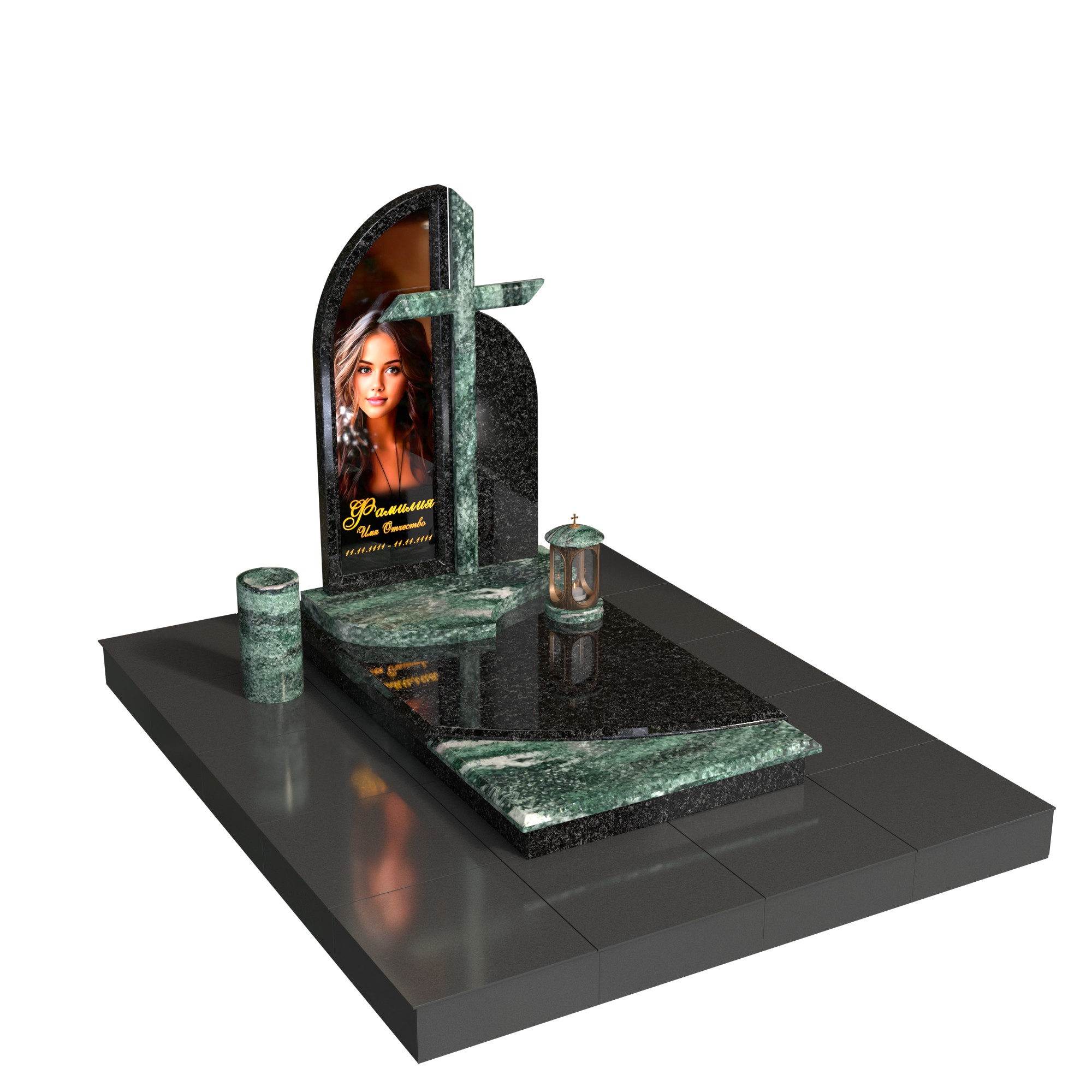 Памятник «Порог света» — современная асимметричная композиция из натурального камня. Изогнутая стела с аккуратной горизонтальной полкой образует изящный архитектурный силуэт и подчёркивает фотопортрет на стекле. Горизонтальная плита с контрастной вставкой, цилиндрическая ваза и лампада на подиуме создают цельный, ухоженный вид участка.